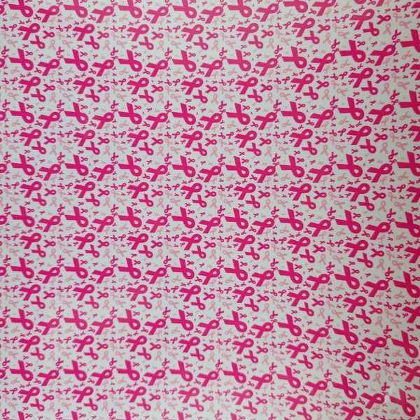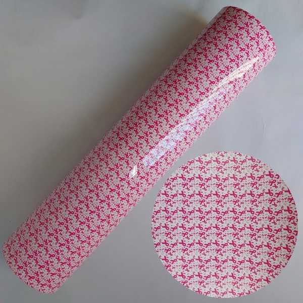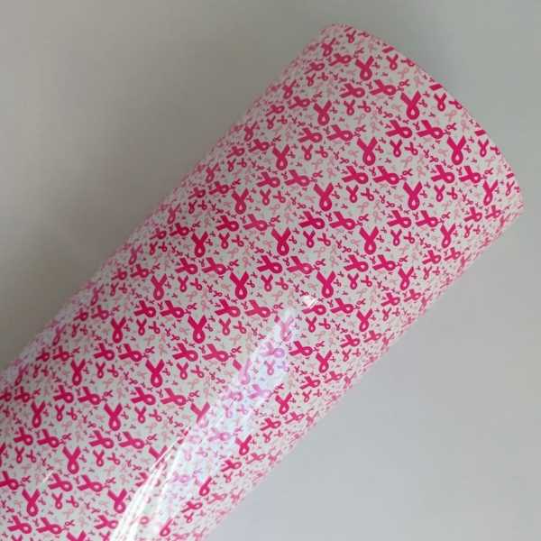 O filme de recorte com estampa do tema Outubro Rosa é um filme de poliuretano (PU) para recorte e termo transferência.